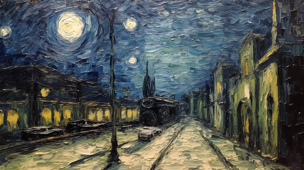 Influenced by the evocative works of Van Gogh, this digital art piece captures the essence of a cold town night. Bold brushstrokes and icy hues depict the stillness and enchantment of the nocturnal scene, echoing Van Gogh's masterful portrayal of atmospheric landscapes.